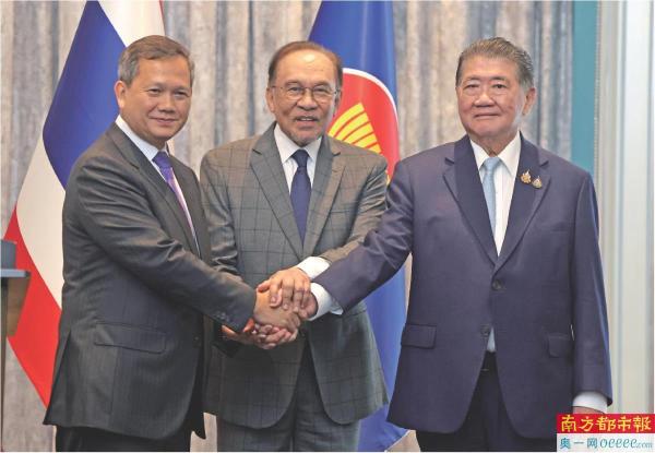 7月28日,在马来西亚布特拉加亚,马来西亚总理安瓦尔(中)、泰国代理总理普坦(右)和柬埔寨首相洪玛奈(左)握手。新华社发