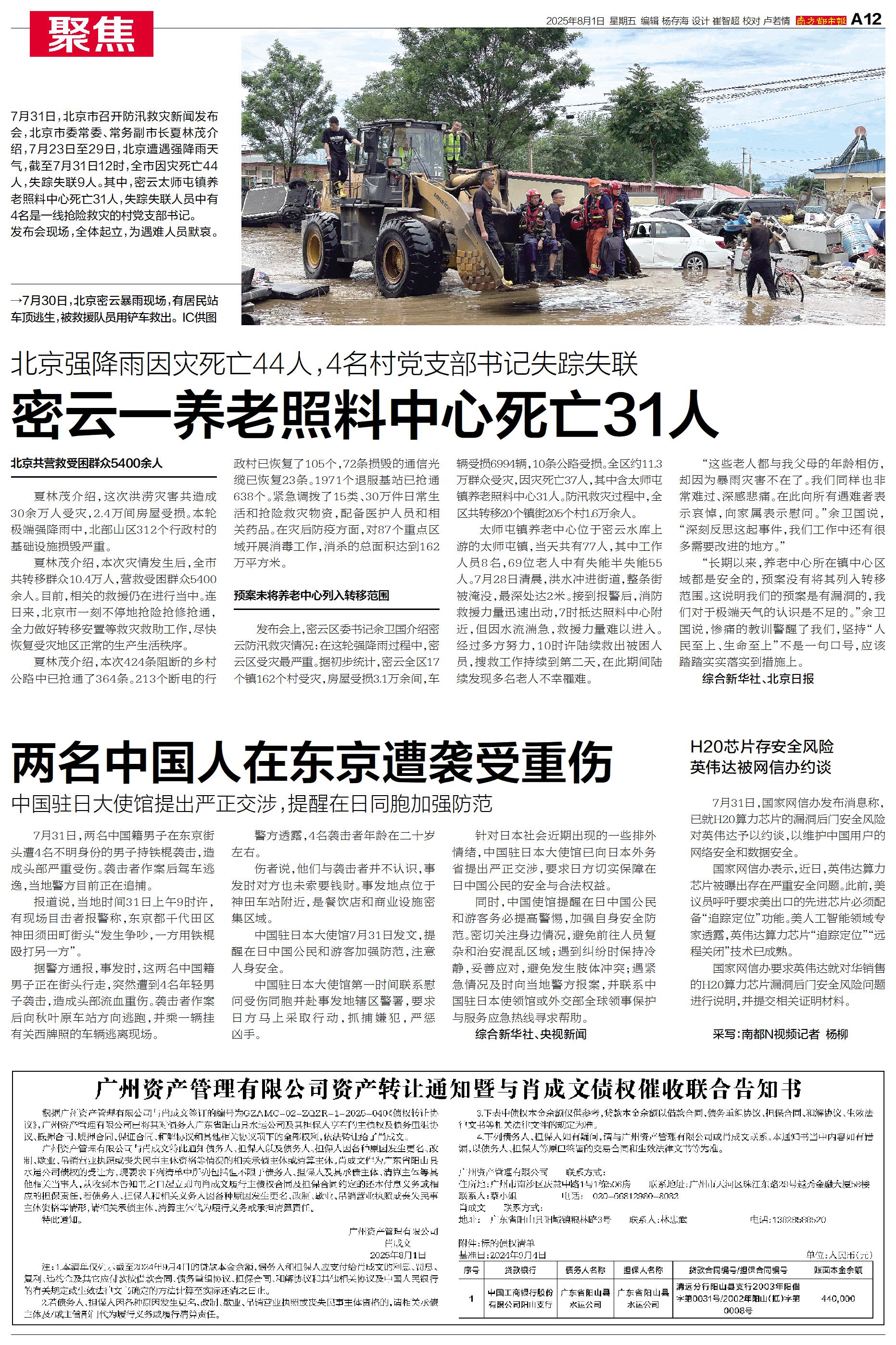 7月31日,北京市召开防汛救灾新闻发布会,北京市委常委、常务副市长夏林茂介绍,7月23日至29日,北京遭遇强降雨天气,截至7月31日12时,全市因灾死亡44人,失踪失联9人。