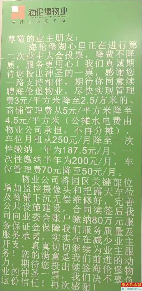 近日,珠海斗门一小区物管主动将3元/平方米的收费标准降低至2.5元/平方米,并交付80万元保证金,希望得到业主投票支持“续签”。该小区名字为海伦堡湖心里(小区备案名“汇景嘉园”),目前正进行第二次业主大会投票,其中一项就是对物管进行考核,业主的投票将决定物管公司去留。
