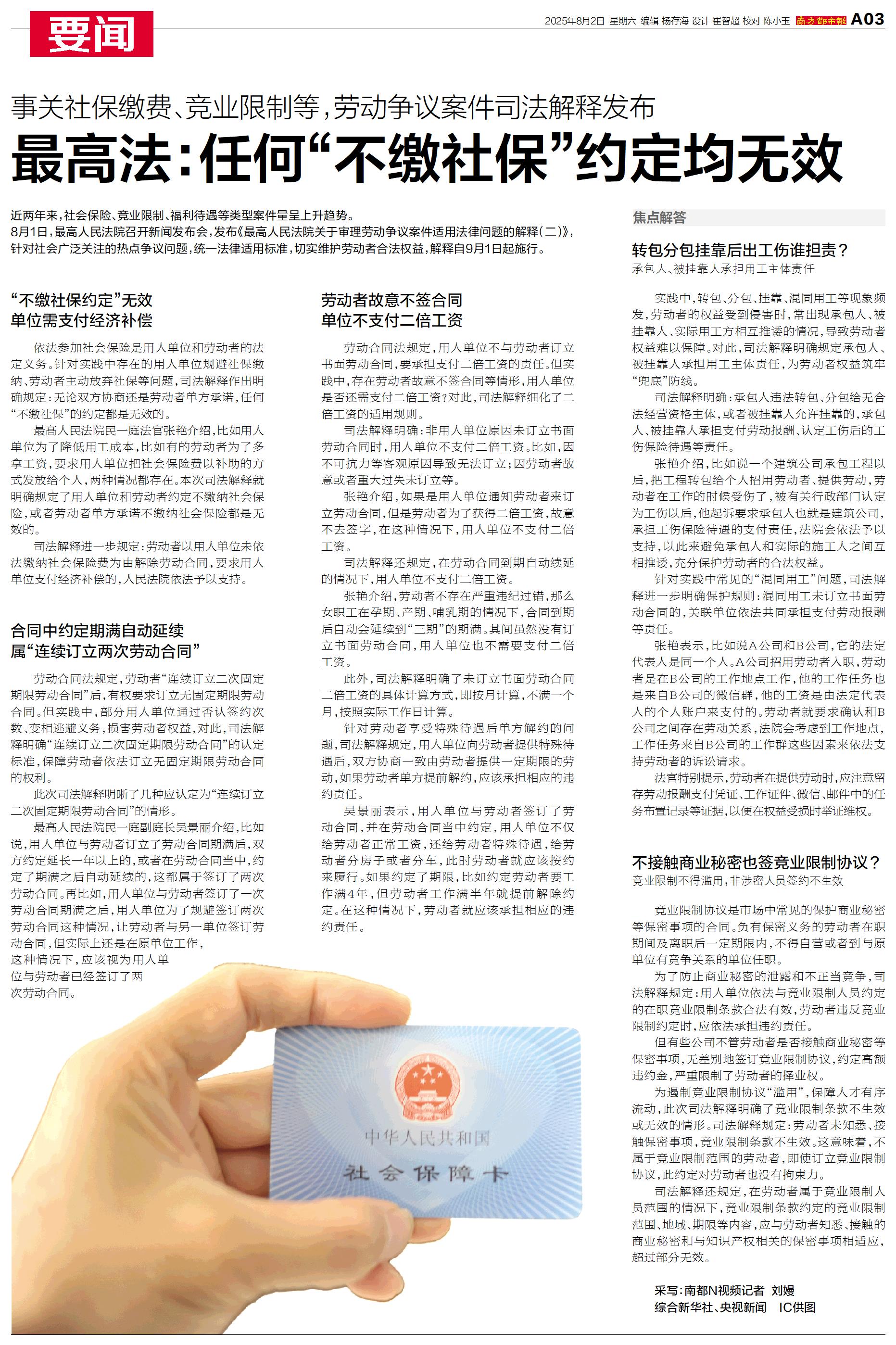 8月1日,最高人民法院召开新闻发布会,发布《最高人民法院关于审理劳动争议案件适用法律问题的解释(二)》,针对社会广泛关注的热点争议问题,统一法律适用标准,切实维护劳动者合法权益,解释自9月1日起施行。