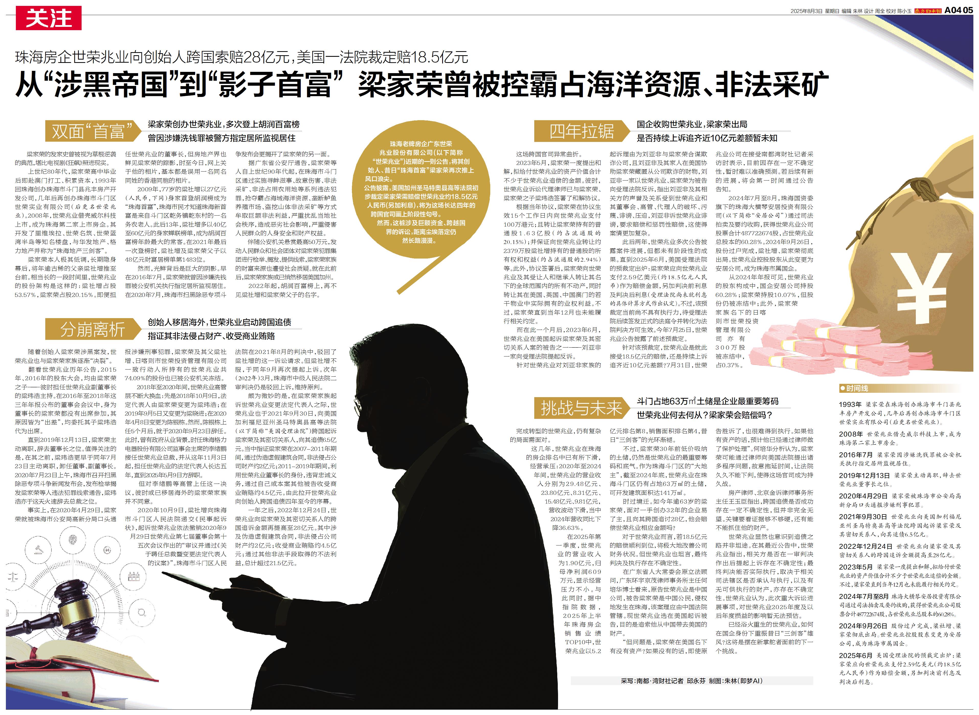 2025年6月 美国受理法院的预裁定出炉:梁家荣应向世荣兆业支付2.59亿美元(约18.5亿元人民币)作为赔偿金额,另加判决前利息及判决后利息。