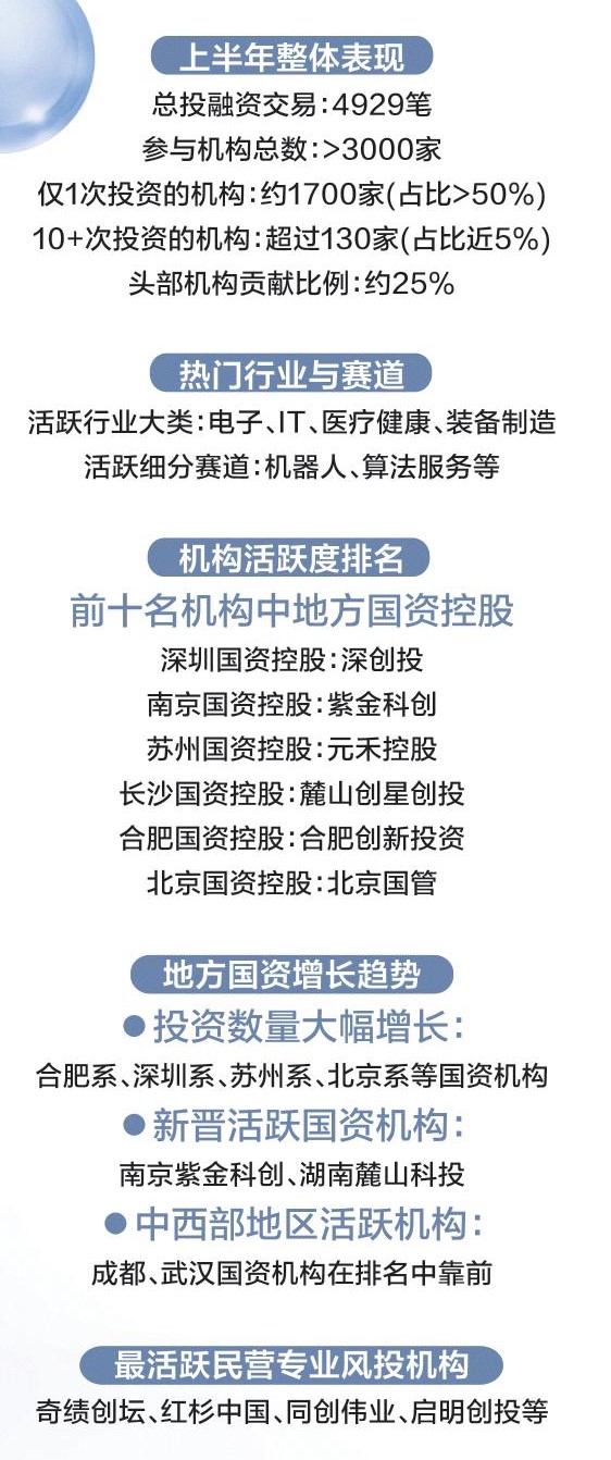 除国资控股机构外,上半年投资活跃度居前的机构中还有几家具有国资出资背景,但进行市场化运作的管理人机构,主要代表为有江苏国资部分出资,总部位于南京的毅达资本,以及有西安国资部分出资,在西安和北京设立双总部的中科创星。