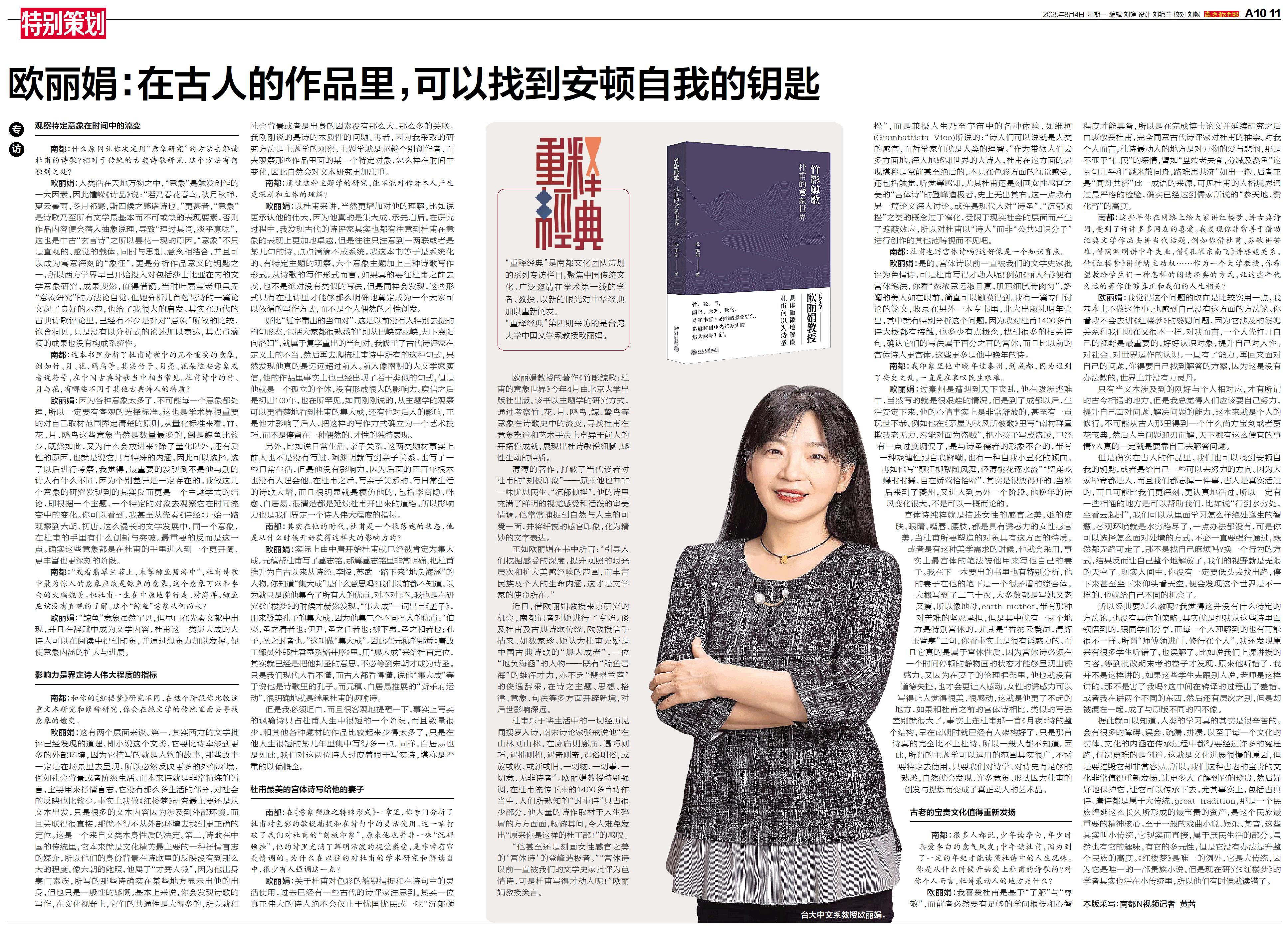 近日,借欧丽娟教授来京研究的机会,南都记者对她进行了专访。谈及杜甫及古典诗歌传统,欧教授信手拈来、如数家珍。她认为杜甫无疑是中国古典诗歌的“集大成者”,一位“地负海涵”的人物——既有“鲸鱼碧海”的雄浑才力,亦不乏“翡翠兰苕”的俊逸辞采,在诗之主题、思想、格律、意象、句法等多方面开辟新境,对后世影响深远。