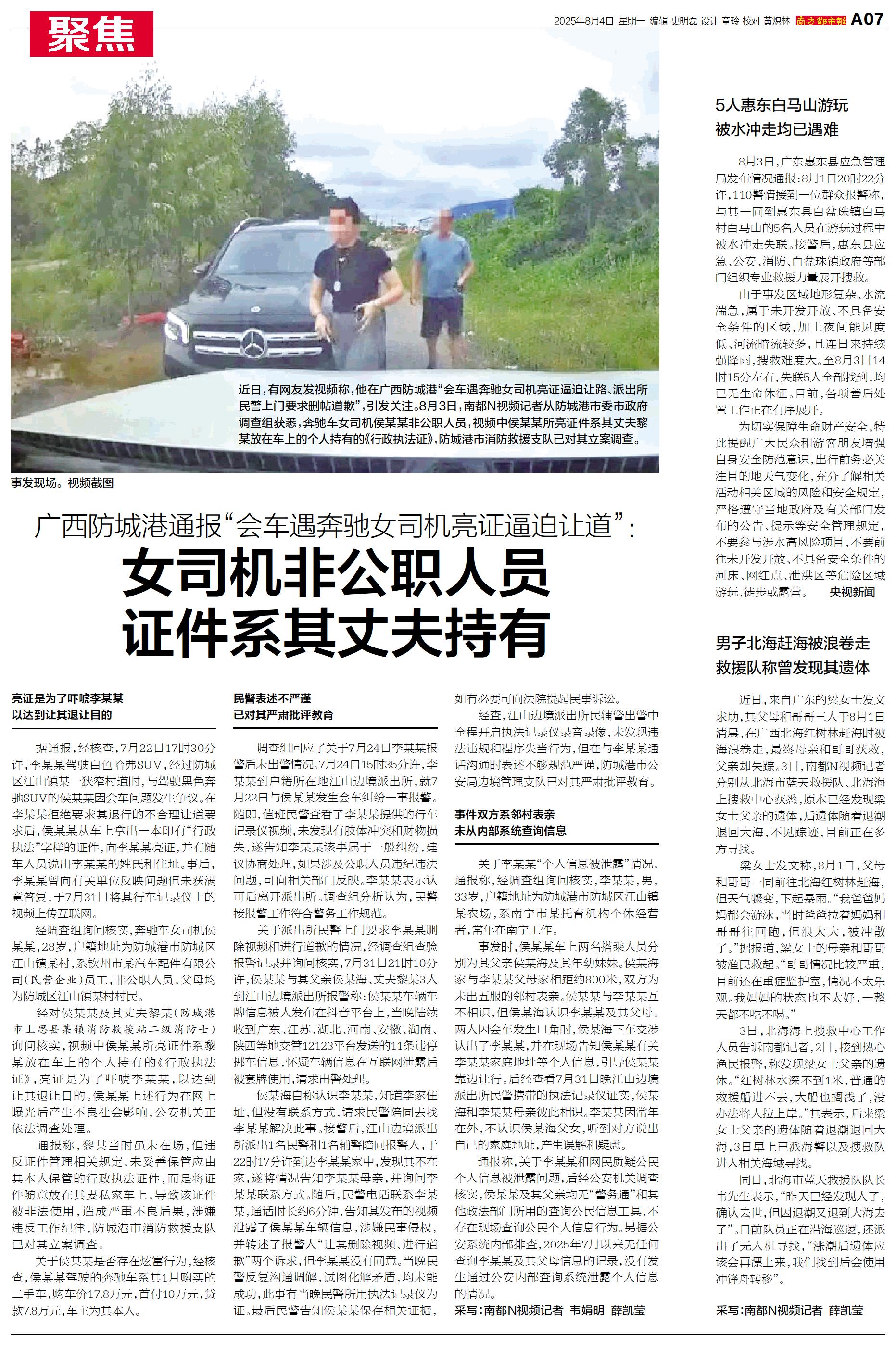 近日,有网友发视频称,他在广西防城港“会车遇奔驰女司机亮证逼迫让路、派出所民警上门要求删帖道歉”,引发关注。