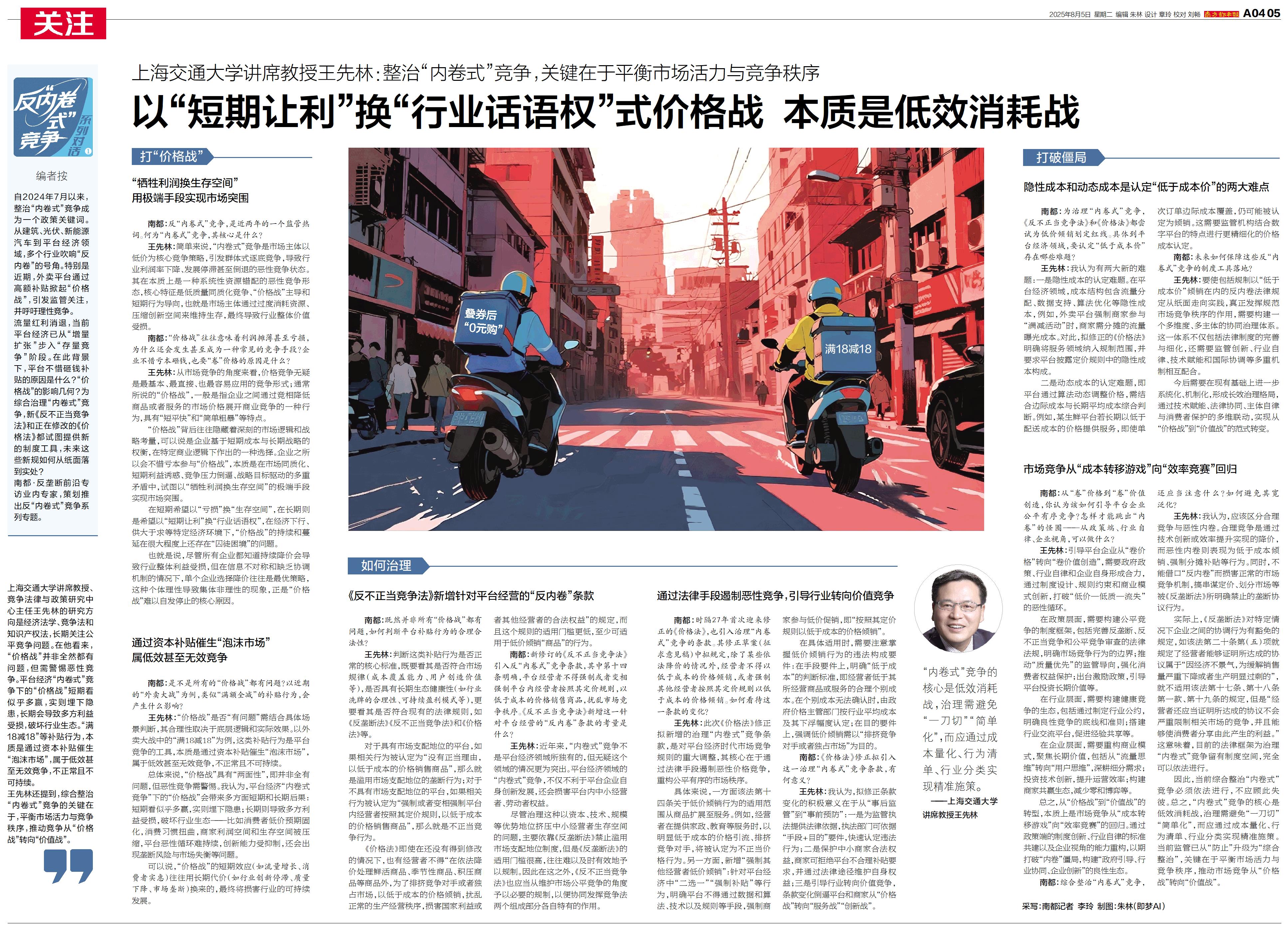 王先林:引导平台企业从“卷价格”转向“卷价值创造”,需要政府政策、行业自律和企业自身形成合力,通过制度设计、规则约束和商业模式创新,打破“低价—低质—流失”的恶性循环。