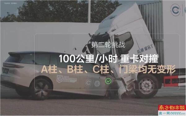 涉事视频画面显示,在“正面对撞(100公里/小时)测试”时,理想i8和重卡正面对撞时,重卡四个车轮弹起,驾驶室几乎倒在理想i8的前车窗上。理想汽车发布的视频画面上配字为:“A柱、B柱、C柱、门梁均无变形”。