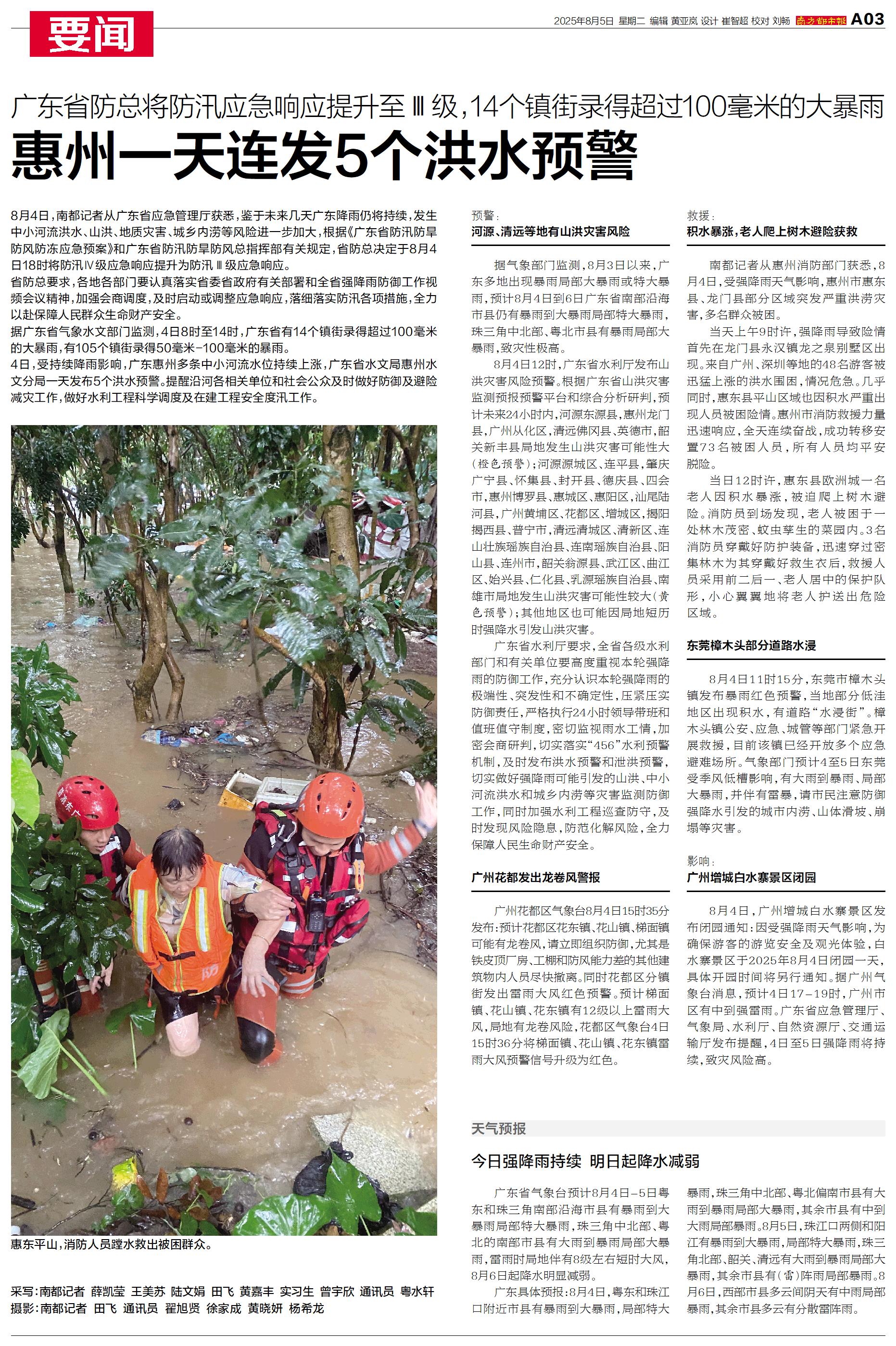 据广东省气象水文部门监测,4日8时至14时,广东省有14个镇街录得超过100毫米的大暴雨,有105个镇街录得50毫米-100毫米的暴雨。