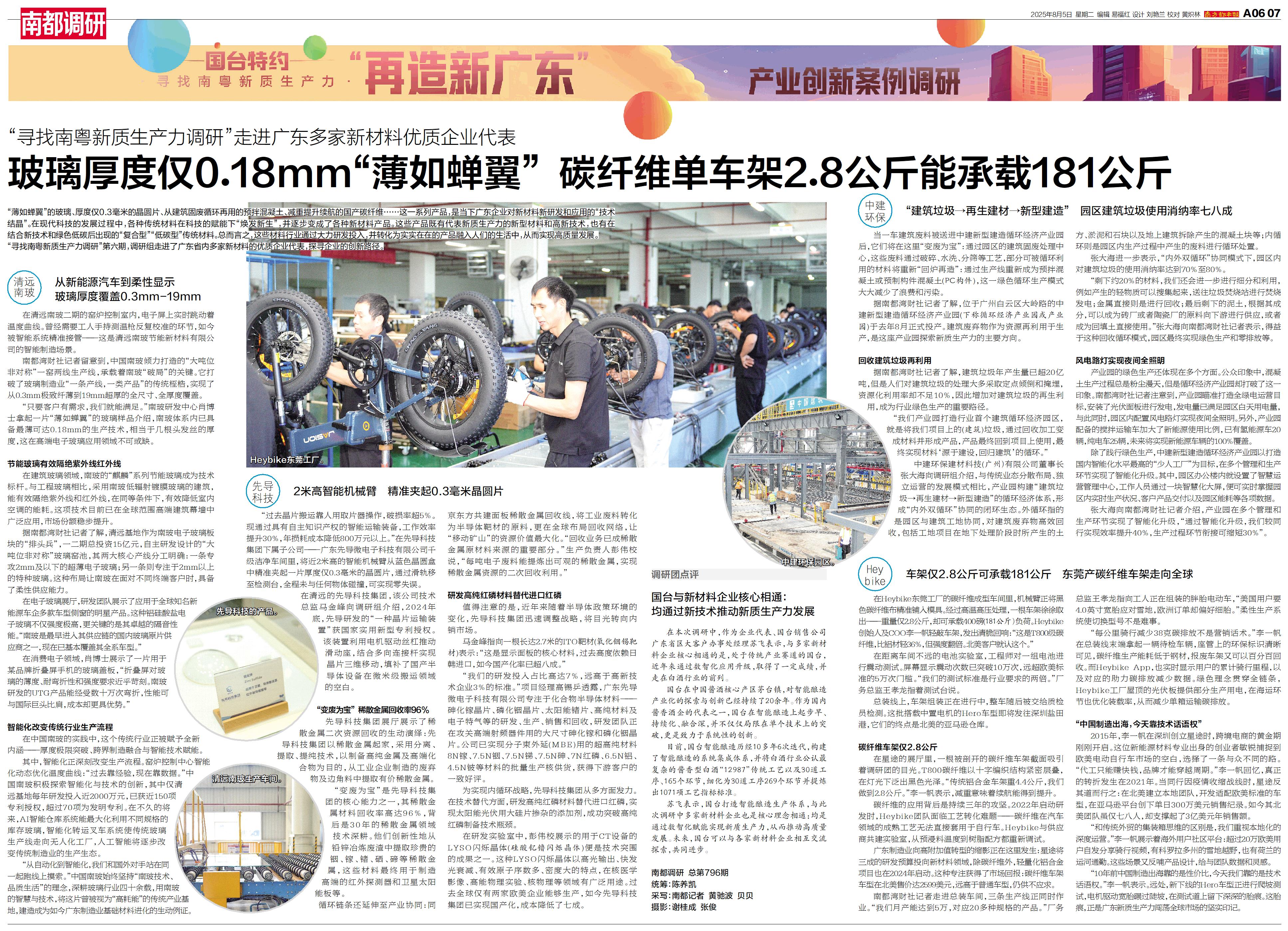 “薄如蝉翼”的玻璃、厚度仅0.3毫米的晶圆片、从建筑固废循环再用的预拌混凝土、减重提升续航的国产碳纤维……这一系列产品,是当下广东企业对新材料新研发和应用的“技术结晶”。