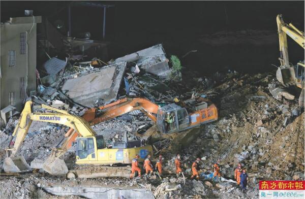 7日晚,广州消防等救援力量仍在白云区山体滑坡现场瓦砾堆中作业。 南都记者 黎湛均 摄
