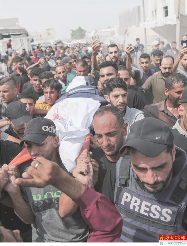8月11日,在加沙城,人们抬着半岛电视台记者阿纳斯·谢里夫的遗体参加葬礼。 新华社发