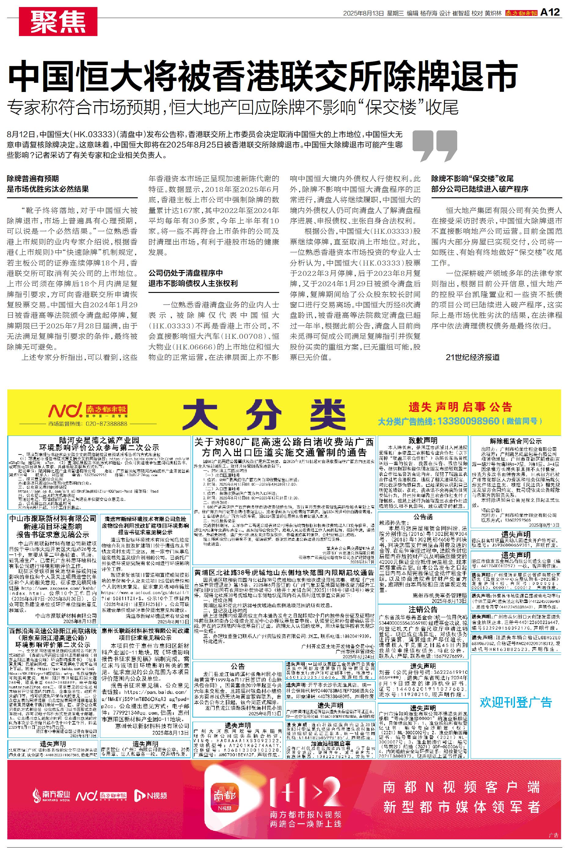 8月12日,中国恒大(HK.03333)(清盘中)发布公告称,香港联交所上市委员会决定取消中国恒大的上市地位,中国恒大无意申请复核除牌决定。