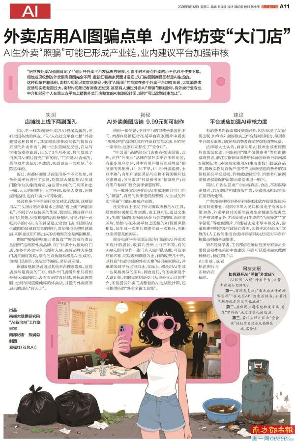 对于商户用AI生成门头图以及店内堂食环境图片这类问题,饿了么向南都记者表示,针对于某些外卖门店使用AI生成的图片作为门头图的问题,饿了么成立了专项治理小组,持续推进这类问题的治理,会通过完善规则、技术研发等方式,加强对于此类门店的识别以及整改。