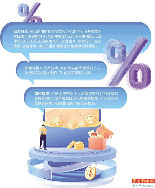 “如果一名消费者使用个人消费贷款,在政策执行期内花了20万元用于装修、购置家具家电等消费品,假设该笔消费贷款年利率为3%,在没有贴息的情况下,他全年需要支付贷款利息是6000元,享受个人消费贷款一个百分点的贴息以后,最高可减少利息支出2000元,这样就可以获得1/3的利息补贴。”于红举例道。