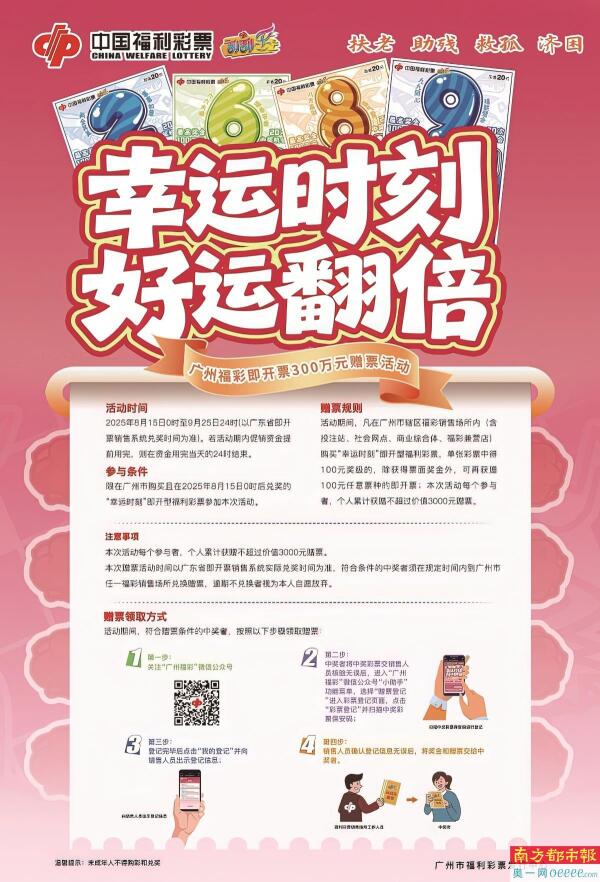 为庆祝“幸运时刻”即开票上市,回馈广大购彩者,广州市福利彩票发行中心决定自2025年8月15日0时起在全市范围内开展“幸运时刻 好运翻倍”即开型福利彩票300万元赠票营销活动。