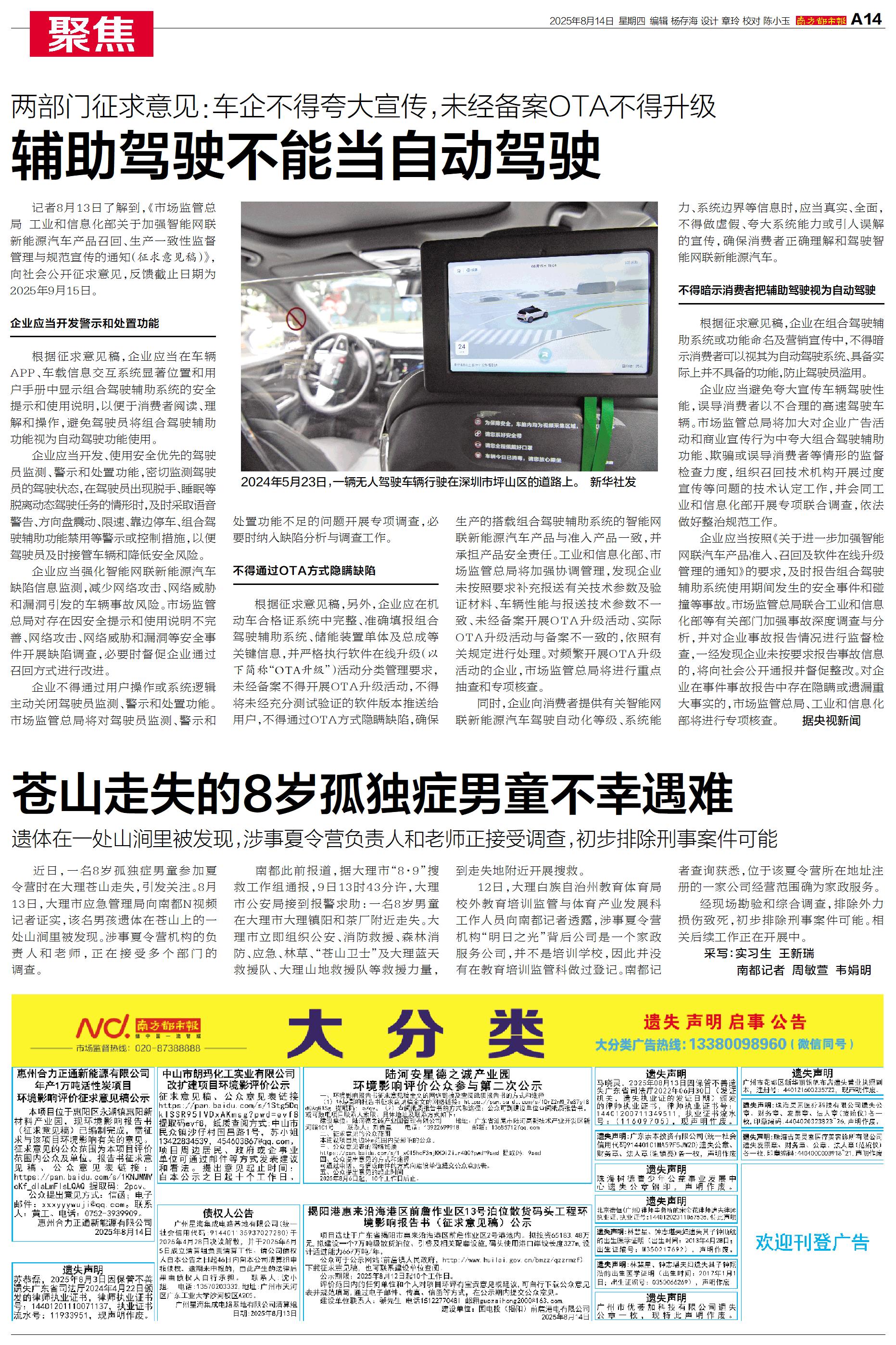 记者8月13日了解到,《市场监管总局 工业和信息化部关于加强智能网联新能源汽车产品召回、生产一致性监督管理与规范宣传的通知(征求意见稿)》,向社会公开征求意见,反馈截止日期为2025年9月15日。