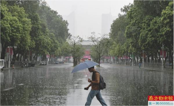 昨日15时30分,广州天河体育中心北门,路人顶着大雨行走。