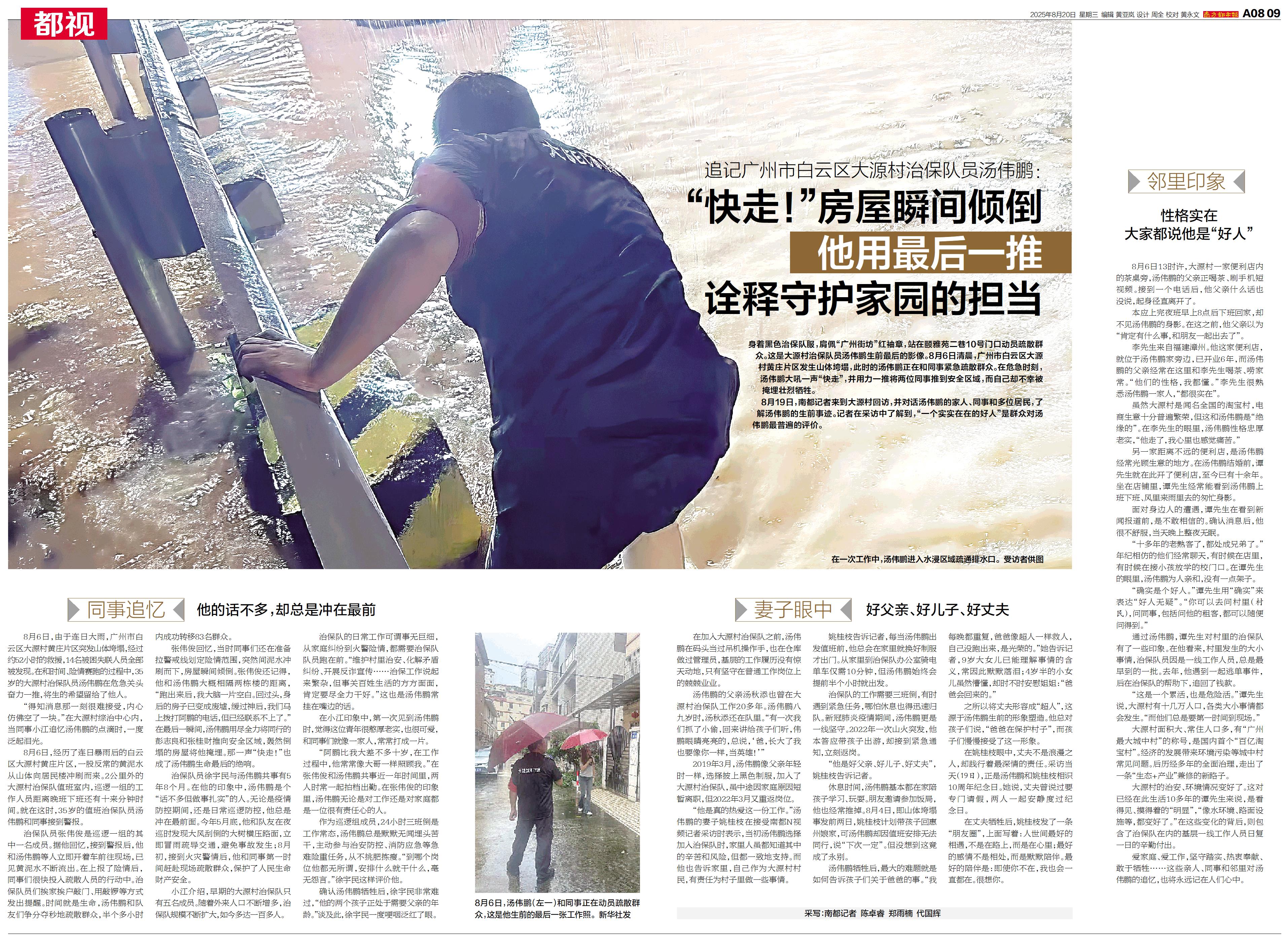 身着黑色治保队服,肩佩“广州街坊”红袖章,站在颐雅苑二巷10号门口动员疏散群众。这是大源村治保队员汤伟鹏生前最后的影像。