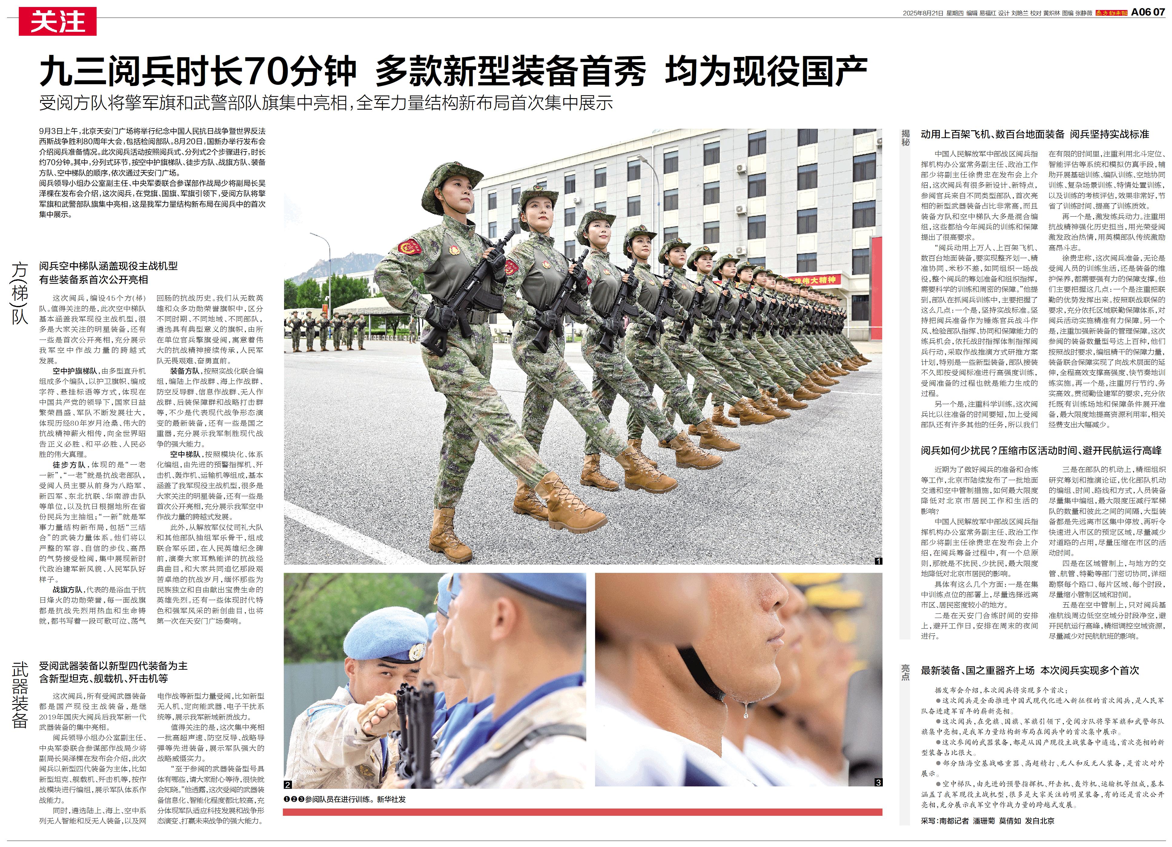 中国人民解放军中部战区阅兵指挥机构办公室常务副主任、政治工作部少将副主任徐贵忠在发布会上介绍,这次阅兵有很多新设计、新特点,参阅官兵来自不同类型部队,首次亮相的新型武器装备占比非常高,而且装备方队和空中梯队大多是混合编组,这些都给今年阅兵的训练和保障提出了很高要求。