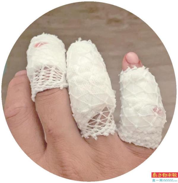 救人受伤后,温晓锋的三根手指裹着厚厚的纱布。