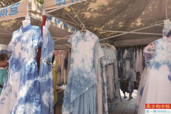 球场外,王大姐在路边卖扎染的衣服。