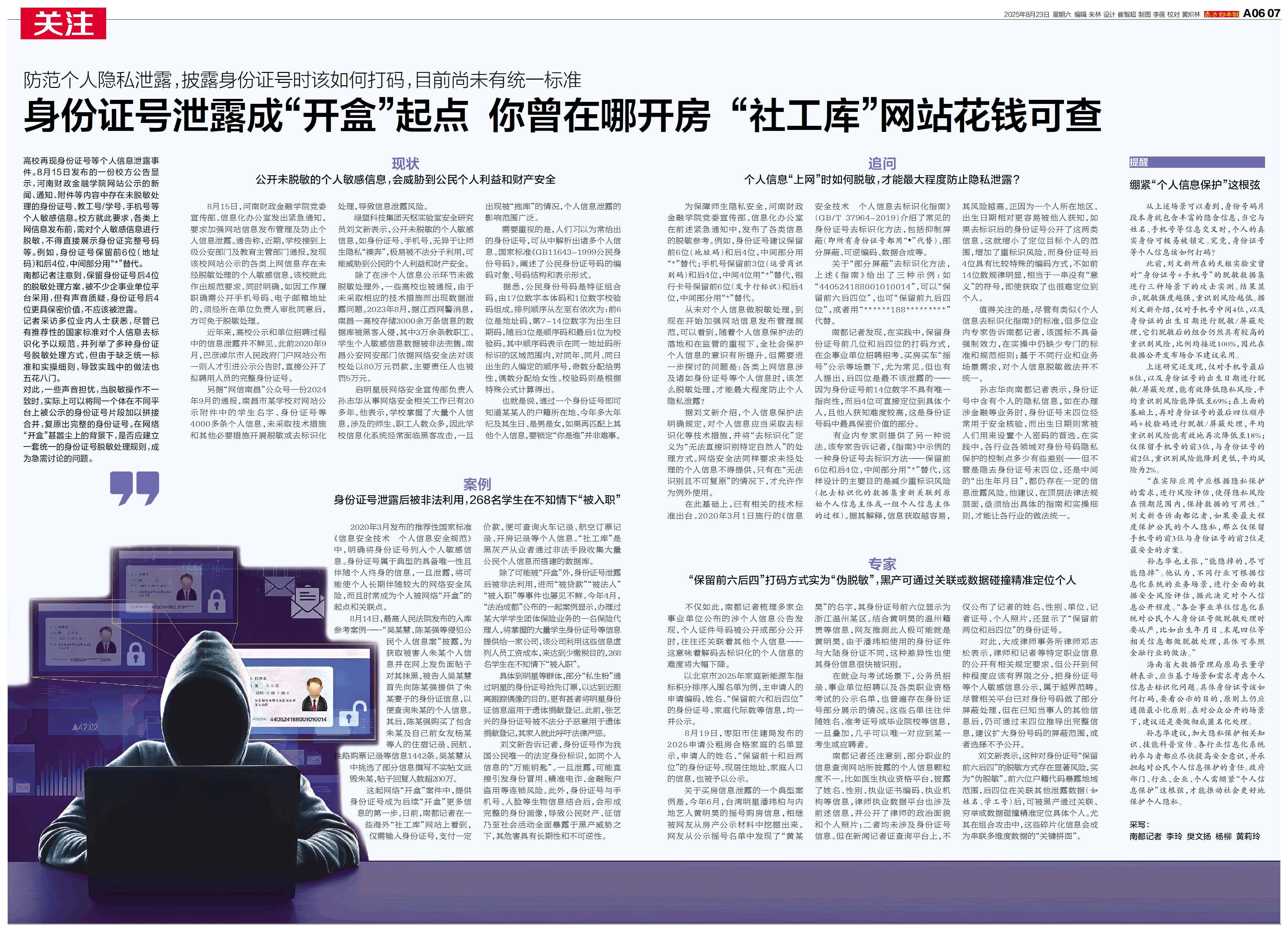 刘文新告诉记者,身份证号作为我国公民唯一的法定身份标识,如同个人信息的“万能钥匙”。一旦泄露,可能直接引发身份冒用、精准电诈、金融账户盗用等连锁风险。此外,身份证号与手机号、人脸等生物信息结合后,会形成完整的身份画像,导致公民财产、征信乃至社会活动全面暴露于黑产威胁之下,其危害具有长期性和不可逆性。