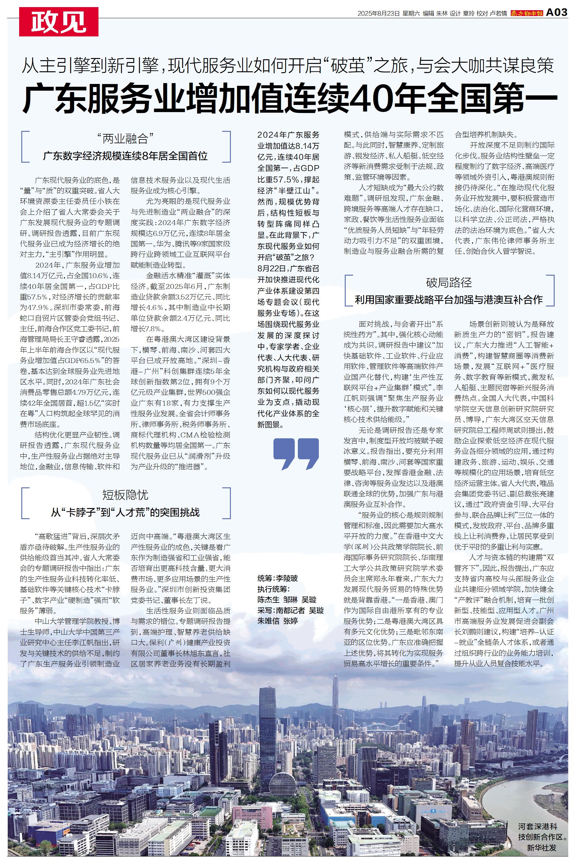 2024年广东服务业增加值达8.14万亿元,连续40年居全国第一,占GDP比重57.5%,撑起经济“半壁江山”。