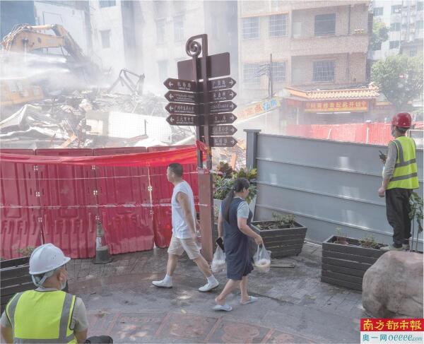 8月23日,广州市白云区三元里村城中村改造项目旧村首开区全面开拆,鸿昇皮具城及群英大街路段实施围蔽,现场有多台钩机进行作业。 南都记者 张志韬 摄