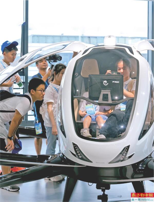 在广州亿航智能,粤港澳青少年们好奇地体验无人驾驶载人航空器。