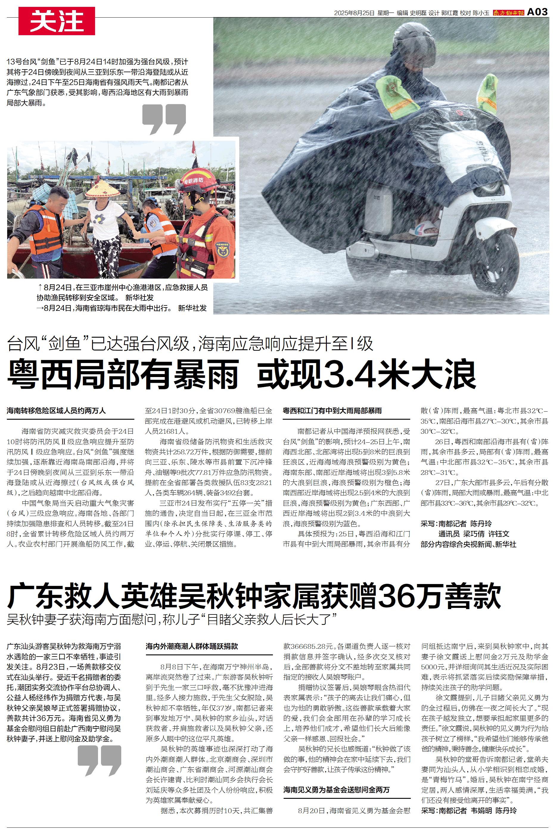 广东汕头游客吴秋钟为救海南万宁溺水遇险的一家三口不幸牺牲,事迹引发关注。