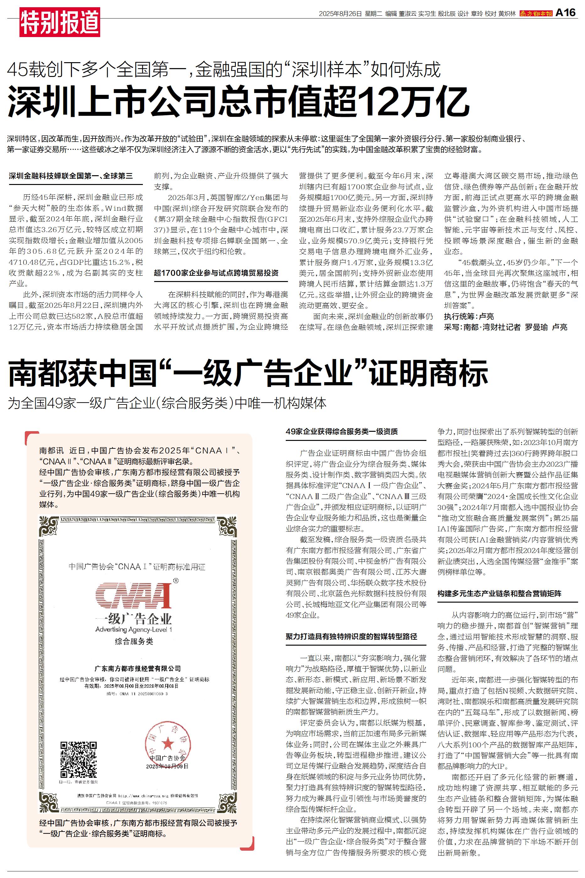 经中国广告协会审核,广东南方都市报经营有限公司被授予“一级广告企业·综合服务类”证明商标,跻身中国一级广告企业行列,为中国49家一级广告企业(综合服务类)中唯一机构媒体。