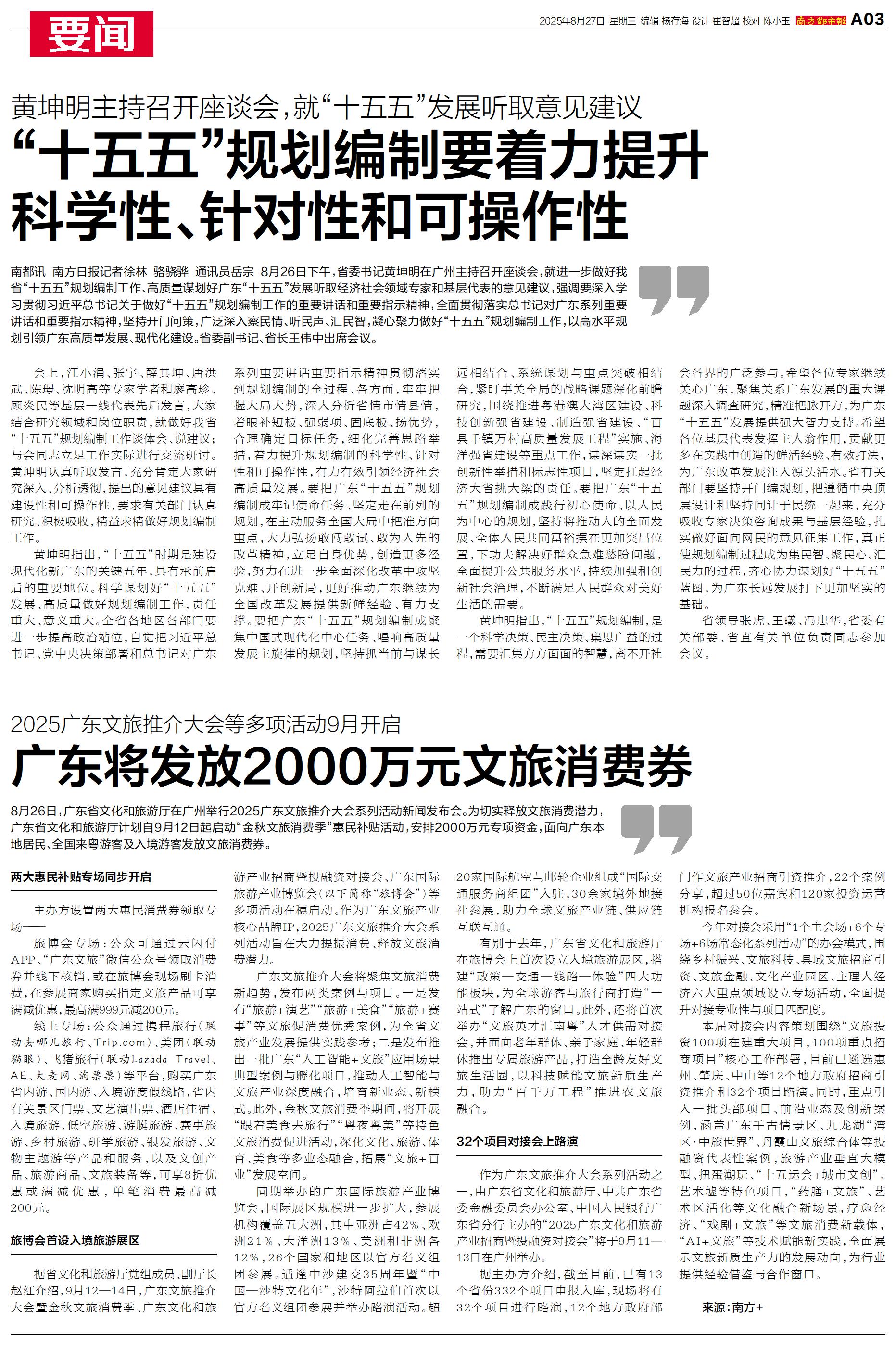 8月26日下午,省委书记黄坤明在广州主持召开座谈会,就进一步做好我省“十五五”规划编制工作、高质量谋划好广东“十五五”发展听取经济社会领域专家和基层代表的意见建议。