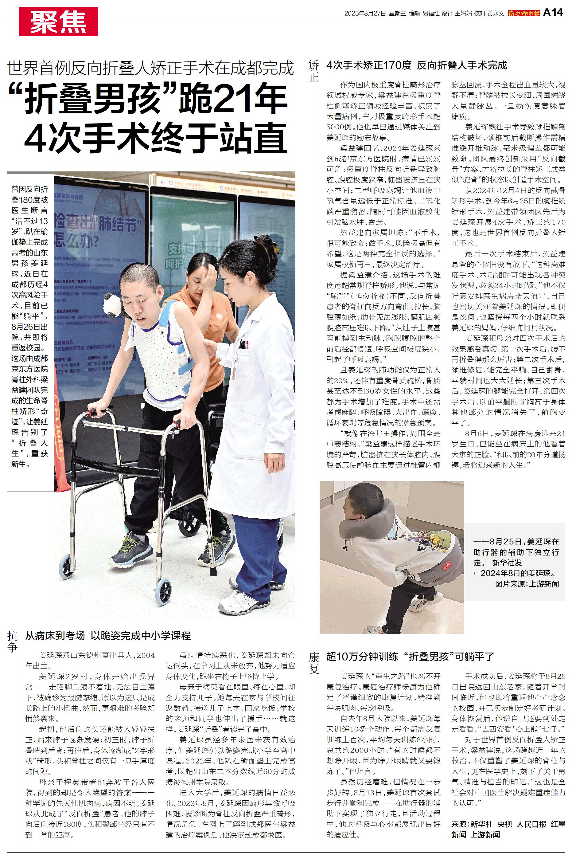 曾因反向折叠180度被医生断言“活不过13岁”,趴在瑜伽垫上完成高考的山东男孩姜延琛,近日在成都历经4次高风险手术,目前已能“躺平”,8月26日出院,并即将重返校园。