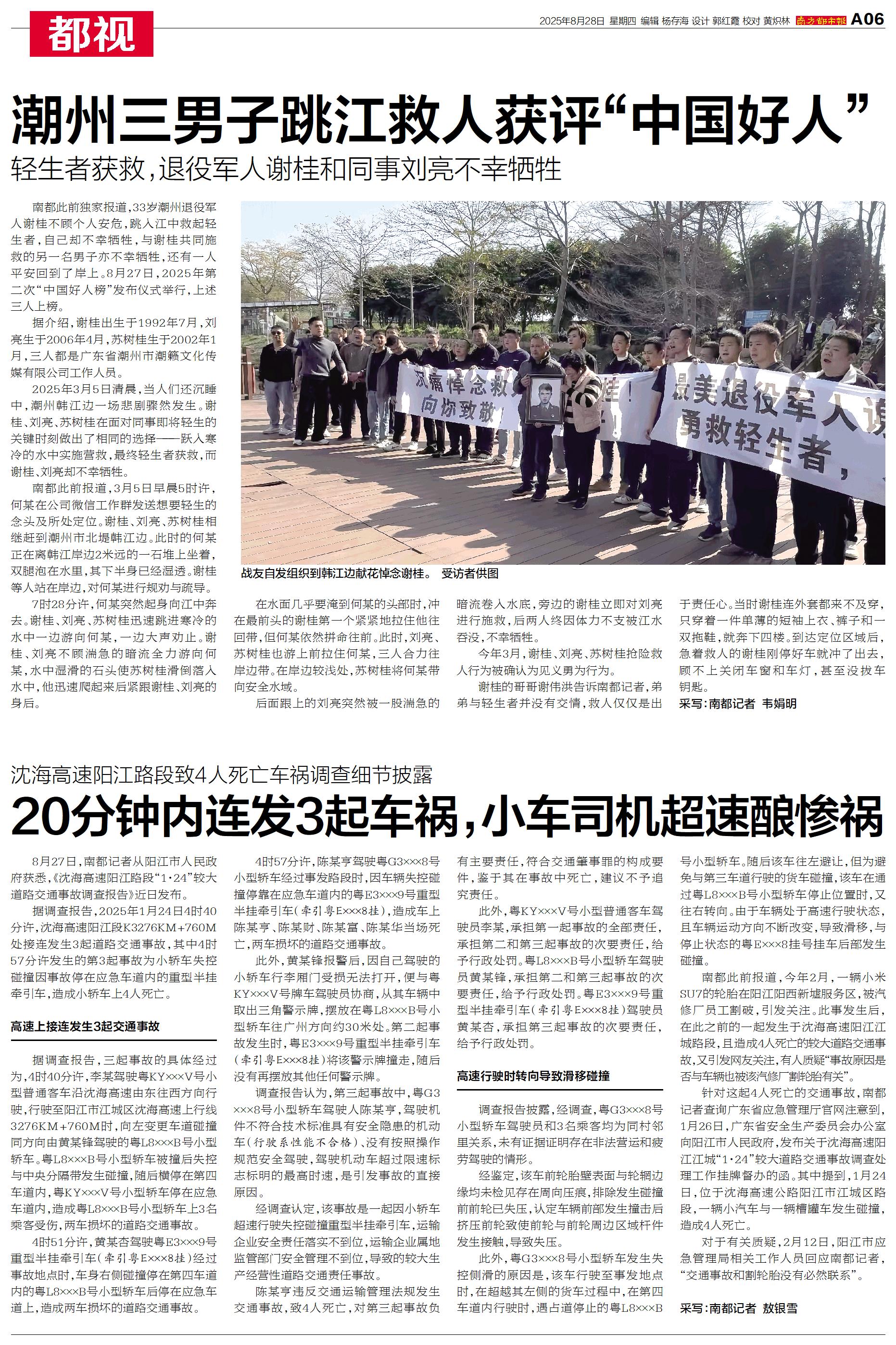 南都此前独家报道,33岁潮州退役军人谢桂不顾个人安危,跳入江中救起轻生者,自己却不幸牺牲,与谢桂共同施救的另一名男子亦不幸牺牲,还有一人平安回到了岸上。