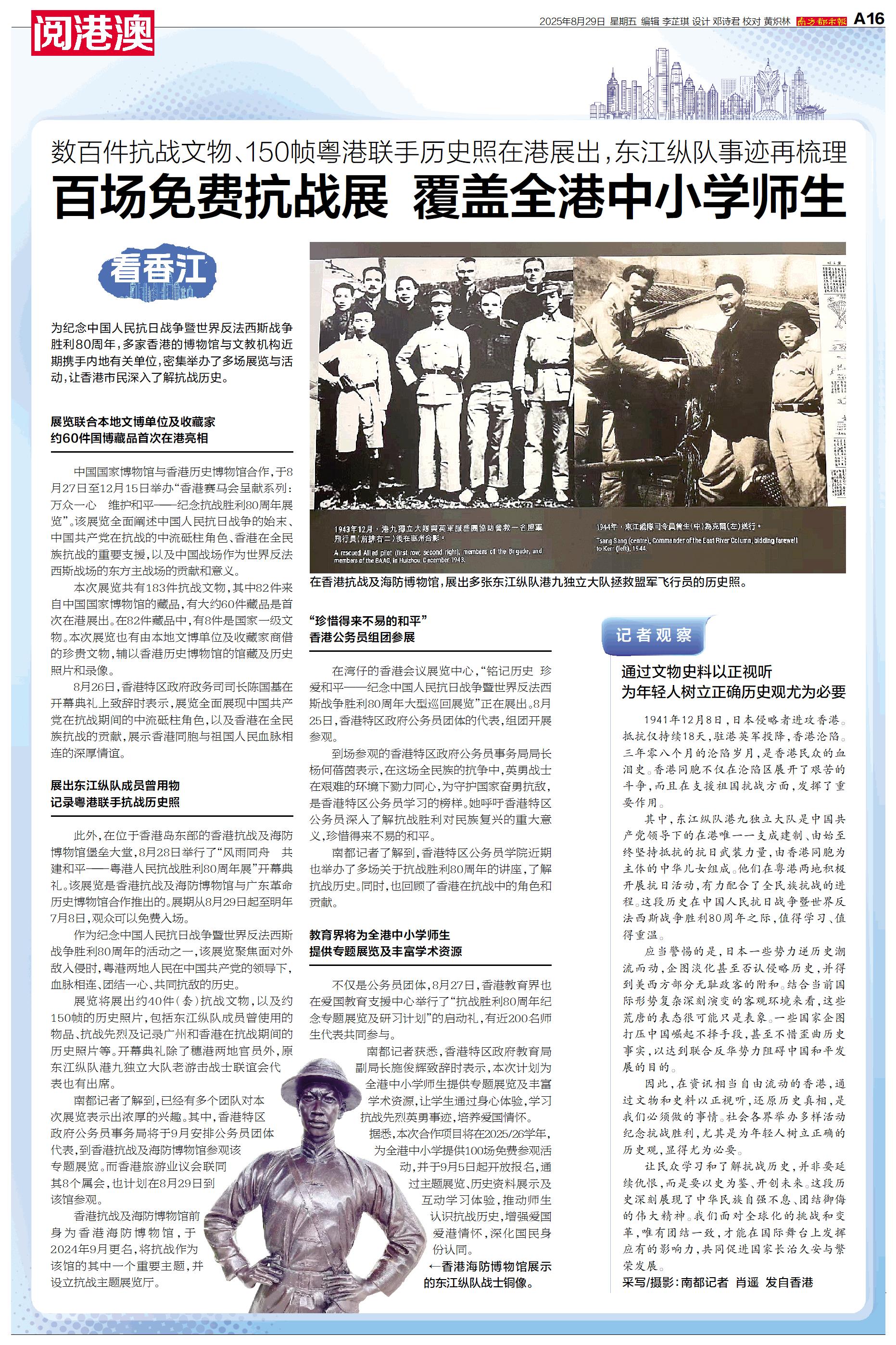 为纪念中国人民抗日战争暨世界反法西斯战争胜利80周年,多家香港的博物馆与文教机构近期携手内地有关单位,密集举办了多场展览与活动,让香港市民深入了解抗战历史。