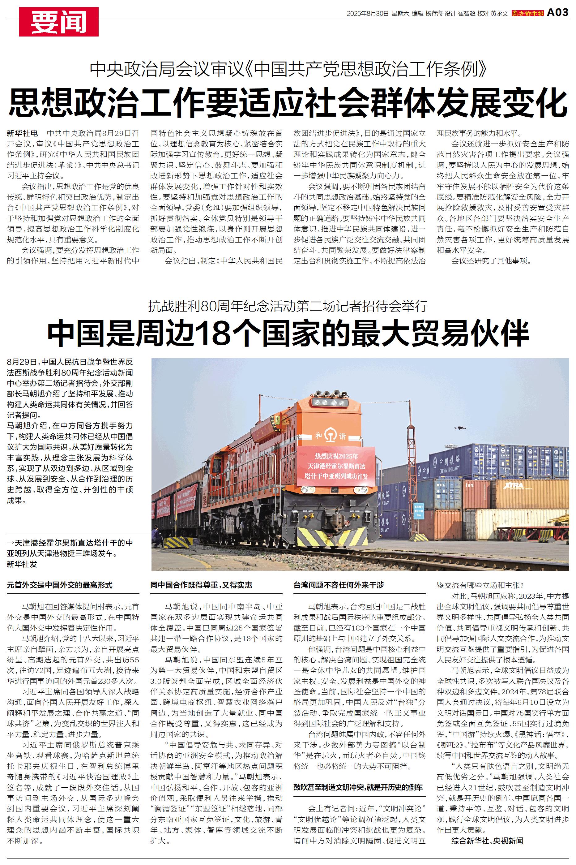 8月29日,中国人民抗日战争暨世界反法西斯战争胜利80周年纪念活动新闻中心举办第二场记者招待会,外交部副部长马朝旭介绍了坚持和平发展、推动构建人类命运共同体有关情况,并回答记者提问。