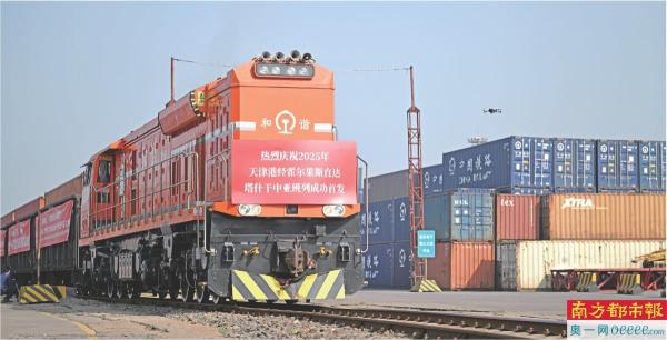 天津港经霍尔果斯直达塔什干的中亚班列从天津港物捷三堆场发车。 新华社发