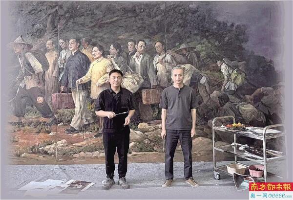 画家杨国强(左)、陈少群站在他们参与创作的油画《文脉薪传——香江大营救》前。 南都记者 朱蓉婷 摄