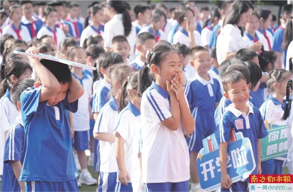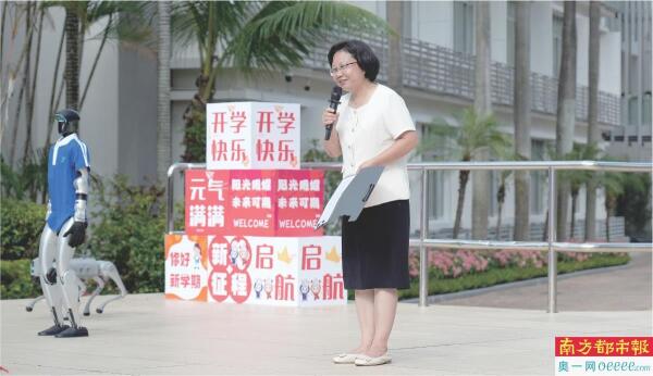 9月1日深圳市南山实验教育集团明远学校迎首批新生。开学典礼上,学校负责人介绍人形机器人同学“明小远”。台下同学们觉得十分新奇好玩。据悉,纪念抗战胜利80周年、迎接十五运、奥运冠军进校园与学子互动成今年多校开学日的亮点。 南都记者 霍健斌 摄