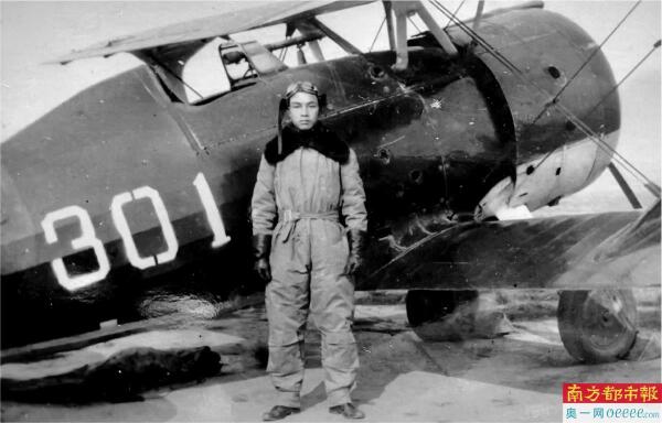 这是一张数十年前的黑白照片,一名身着套装、头戴飞行帽的年轻人身姿笔挺,站立在一架标有号码“301”的飞机前,神情严肃。