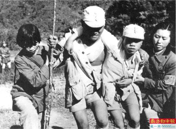 长沙会战中,两名中国红十字会护士帮助两个中国伤兵前往战地医院。 中国近代影像资料库供图