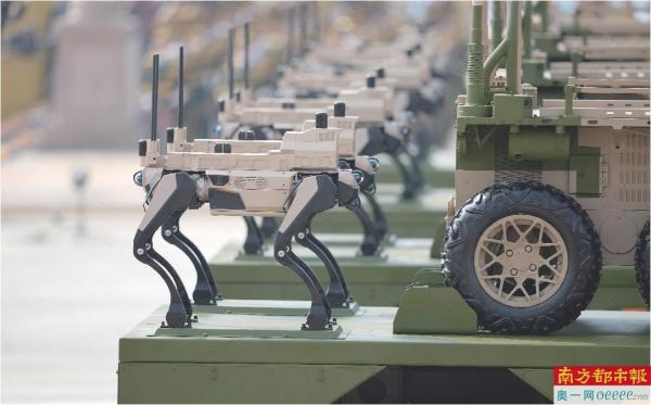 “机器狼”出现在陆上无人作战方队。它可以扛起最高20公斤的物体,续航里程约10公里,运行时间约2.5小时,能在30秒内完成电池更换。它还能在40度的陡坡爬行,能越过30厘米高的障碍物,在废墟上如履平地,从而适应复杂地形环境。
