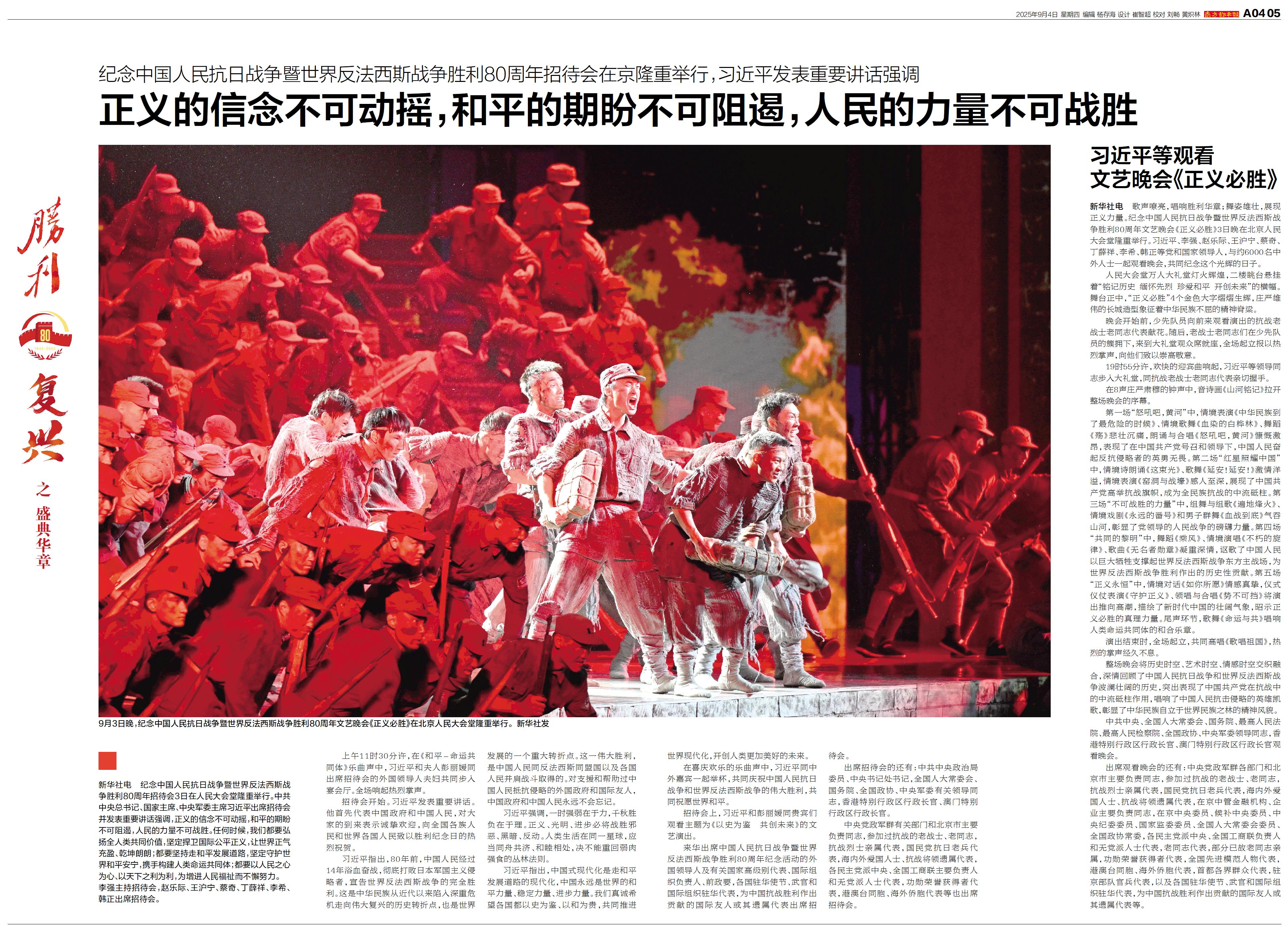 纪念中国人民抗日战争暨世界反法西斯战争胜利80周年文艺晚会《正义必胜》3日晚在北京人民大会堂隆重举行。
