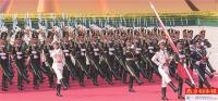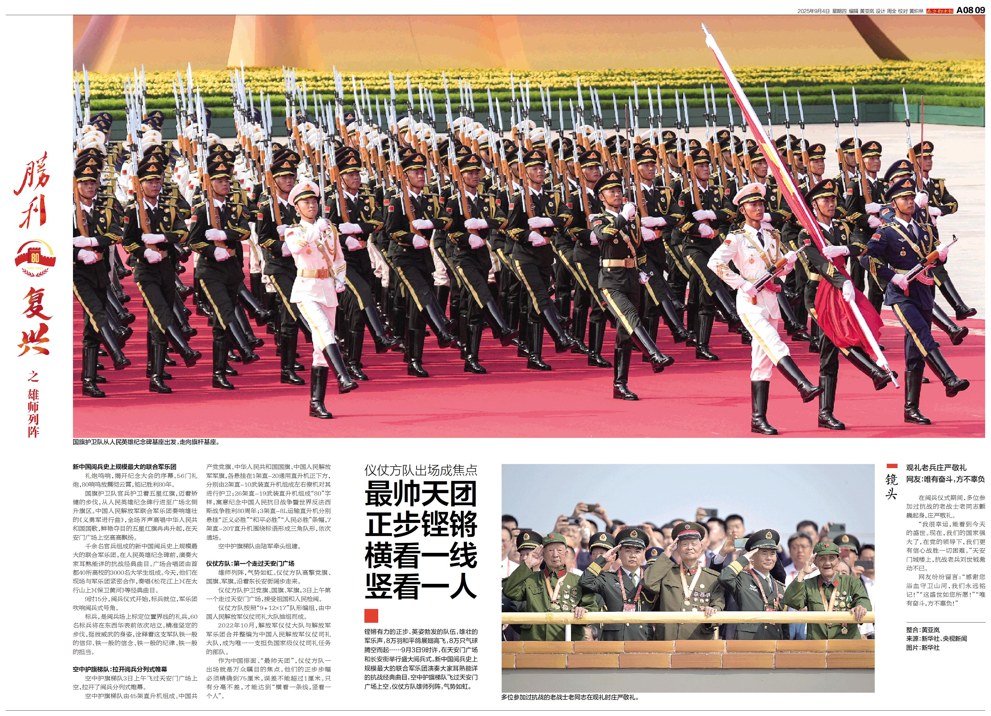 新中国阅兵史上规模最大的联合军乐团演奏大家耳熟能详的抗战经典曲目,空中护旗梯队飞过天安门广场上空,仪仗方队雄师列阵,气势如虹。