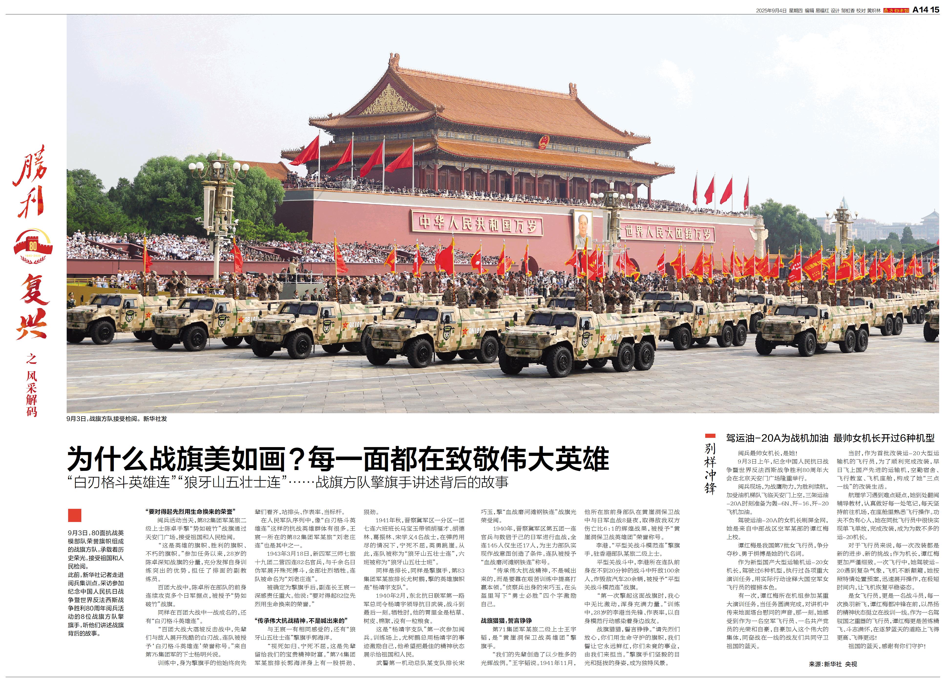9月3日,80面抗战英模部队荣誉旗帜组成的战旗方队,承载着历史荣光,接受祖国和人民检阅。