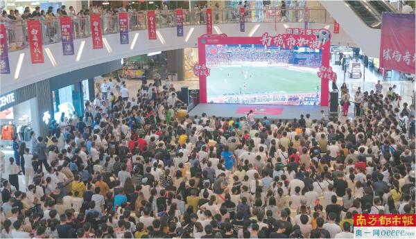 6月29日,市民、球迷在南通市内一处商场观看“苏超”比赛直播。南通城区内众多商场、景区、户外广场利用室内外大屏进行赛事直播,方便市民、球迷“全域”观赛,享受比赛带来的快乐。 新华社发