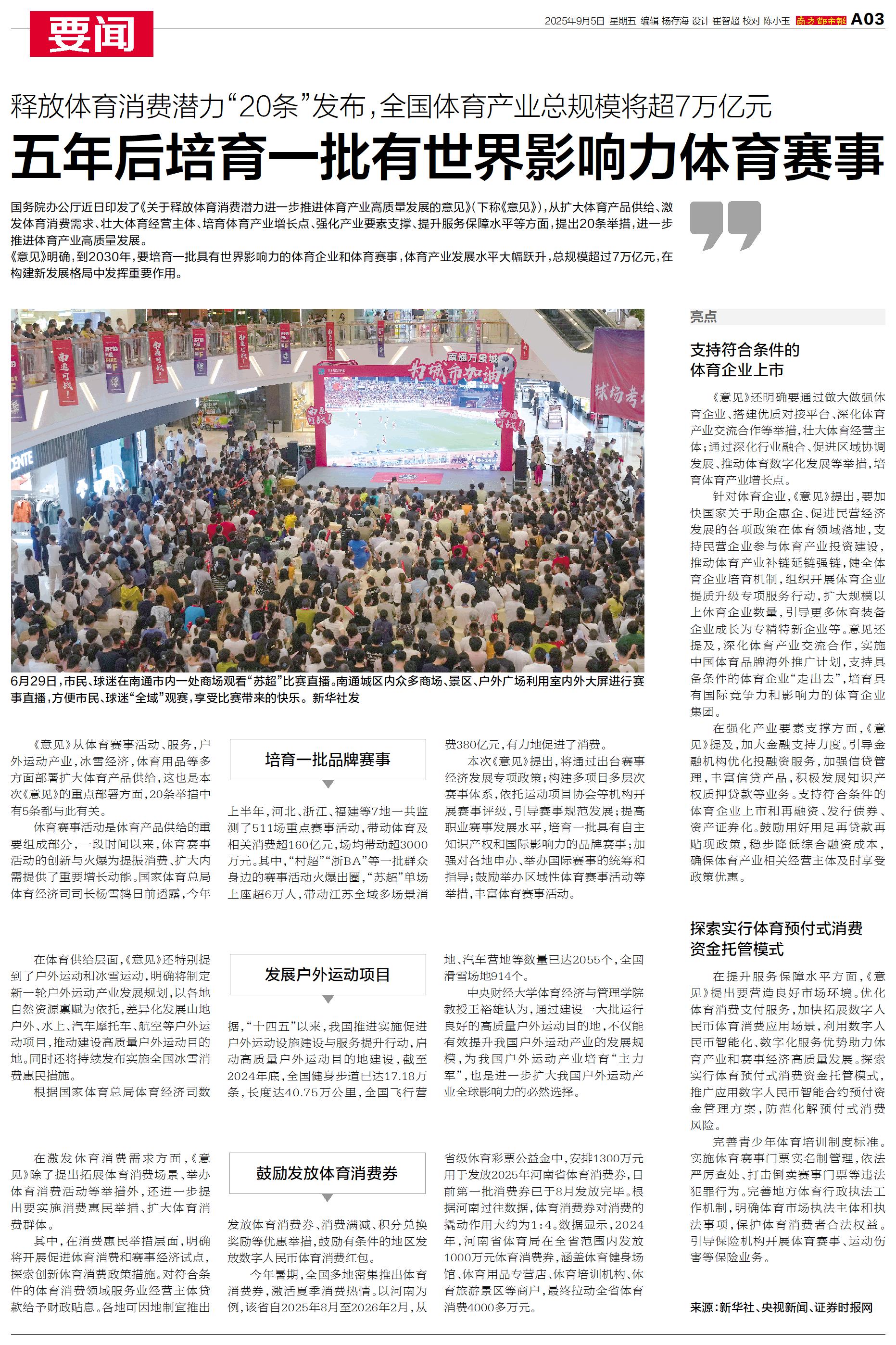 国务院办公厅近日印发了《关于释放体育消费潜力进一步推进体育产业高质量发展的意见》。