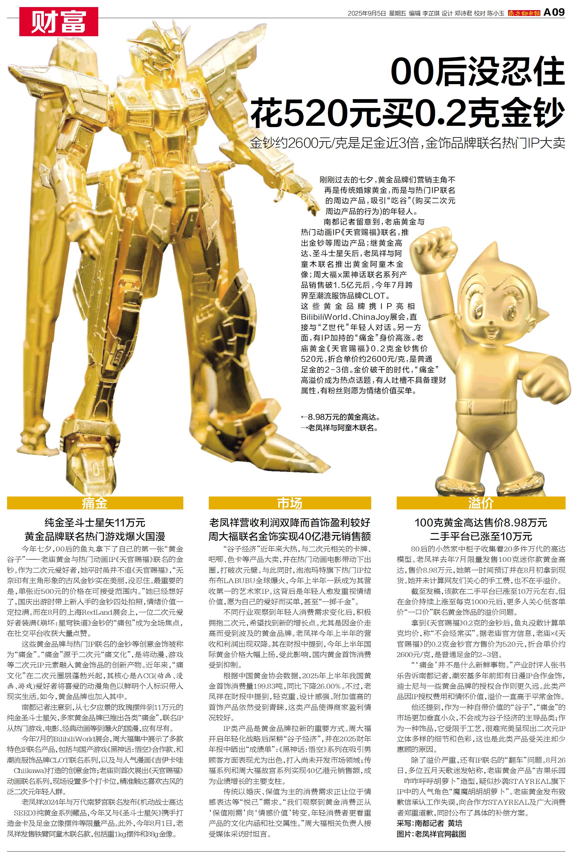 刚刚过去的七夕,黄金品牌们营销主角不再是传统婚嫁黄金,而是与热门IP联名的周边产品,吸引“吃谷”(购买二次元周边产品的行为)的年轻人。