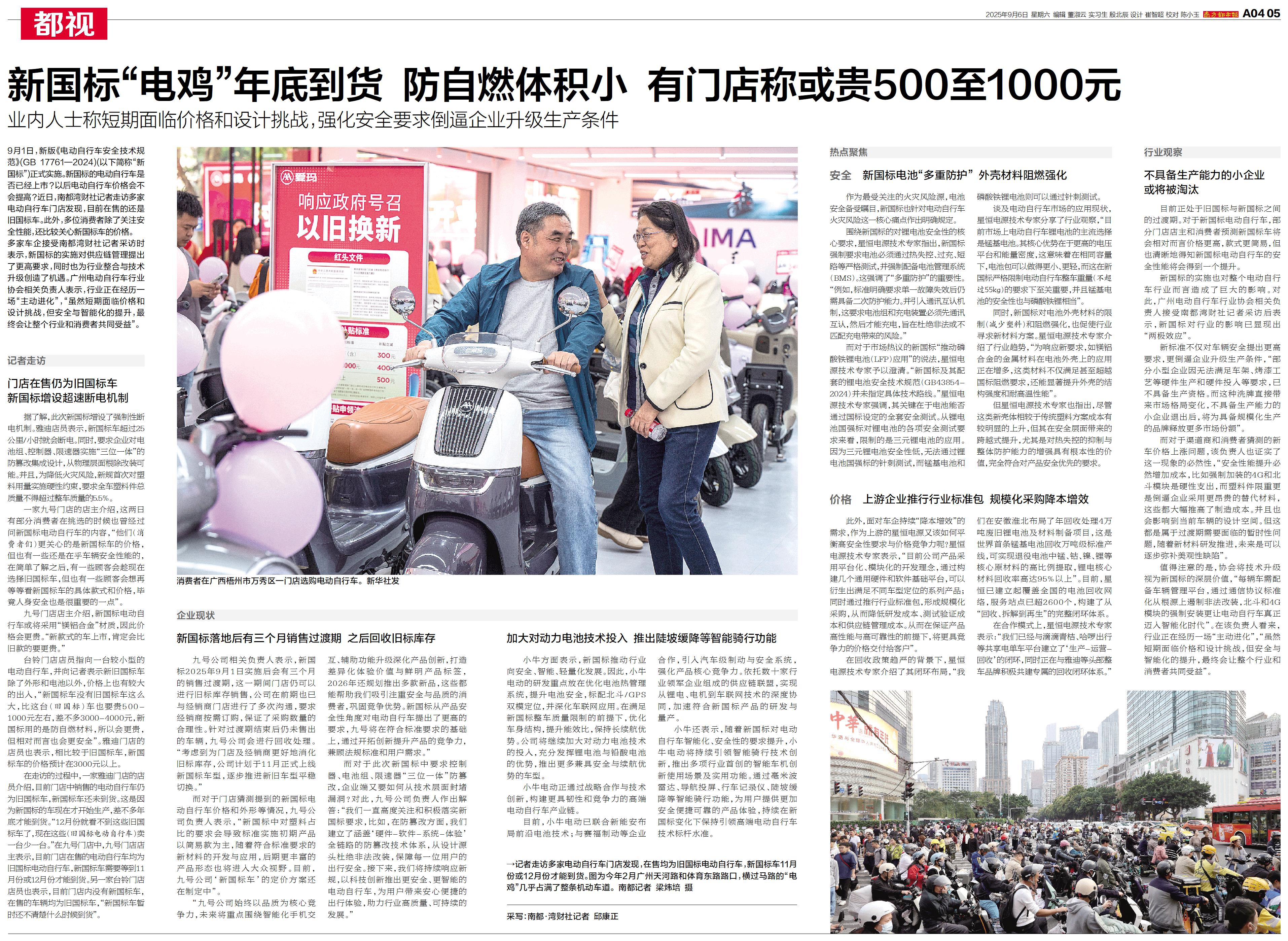 9月1日,新版《电动自行车安全技术规范》(GB 17761—2024)(以下简称“新国标”)正式实施。新国标的电动自行车是否已经上市?以后电动自行车价格会不会提高?近日,南都湾财社记者走访多家电动自行车门店发现,目前在售的还是旧国标车。此外,多位消费者除了关注安全性能,还比较关心新国标车的价格。