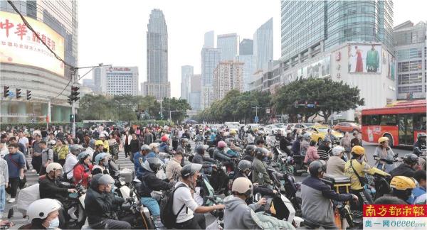 记者走访多家电动自行车门店发现,在售均为旧国标电动自行车,新国标车11月份或12月份才能到货。图为今年2月广州天河路和体育东路路口,横过马路的“电鸡”几乎占满了整条机动车道。 南都记者 梁炜培 摄