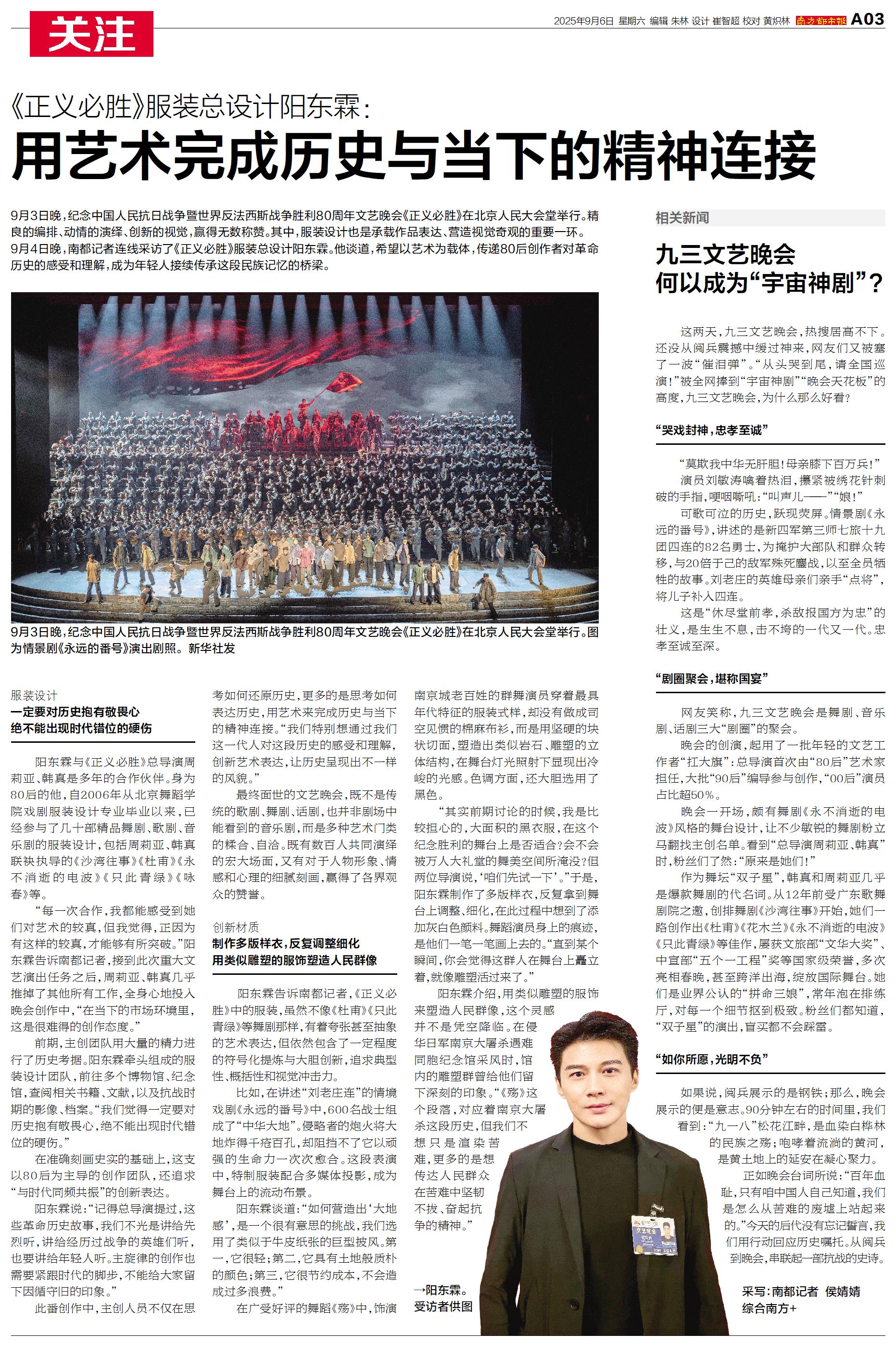 9月3日晚,纪念中国人民抗日战争暨世界反法西斯战争胜利80周年文艺晚会《正义必胜》在北京人民大会堂举行。精良的编排、动情的演绎、创新的视觉,赢得无数称赞。其中,服装设计也是承载作品表达、营造视觉奇